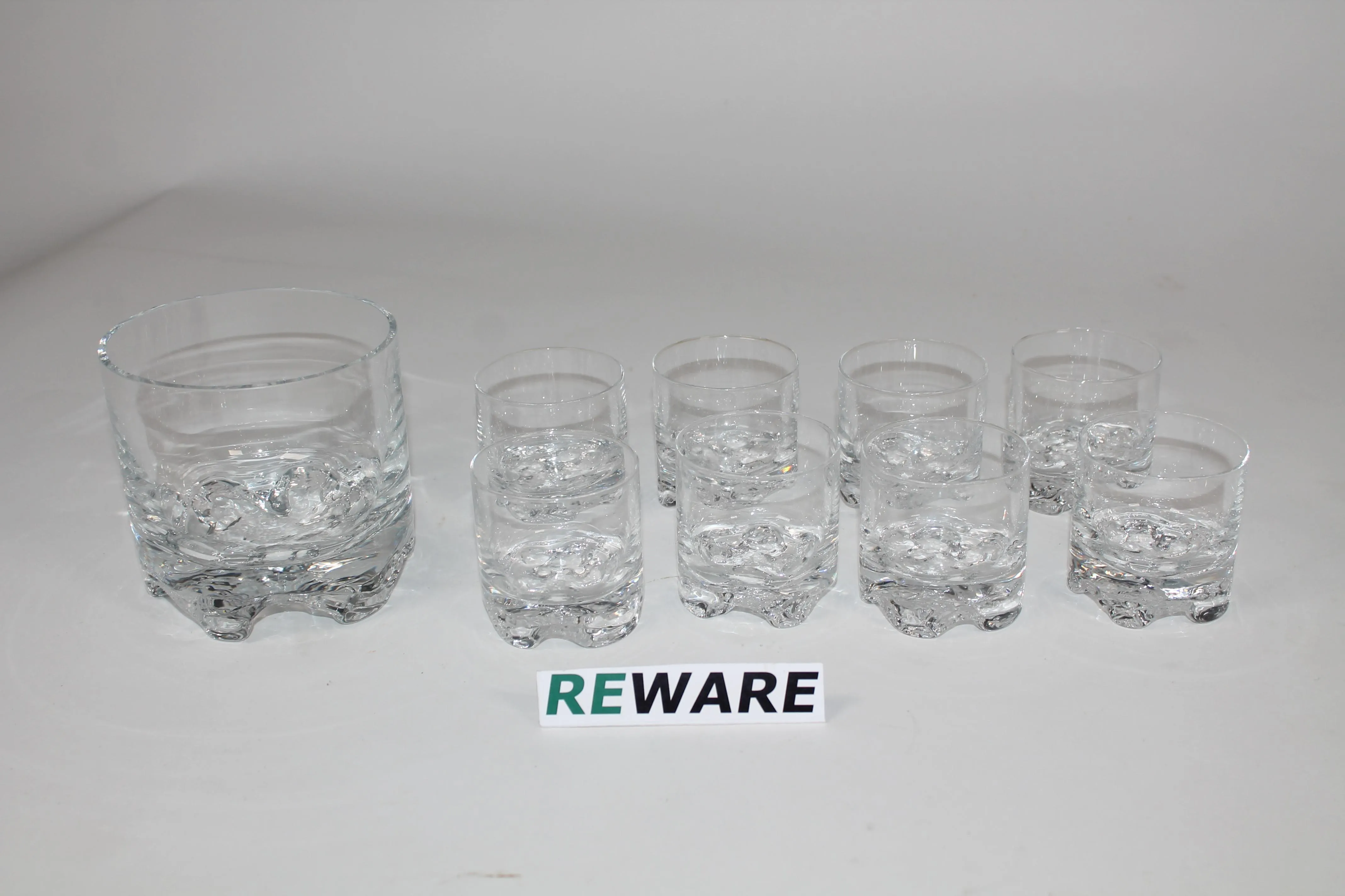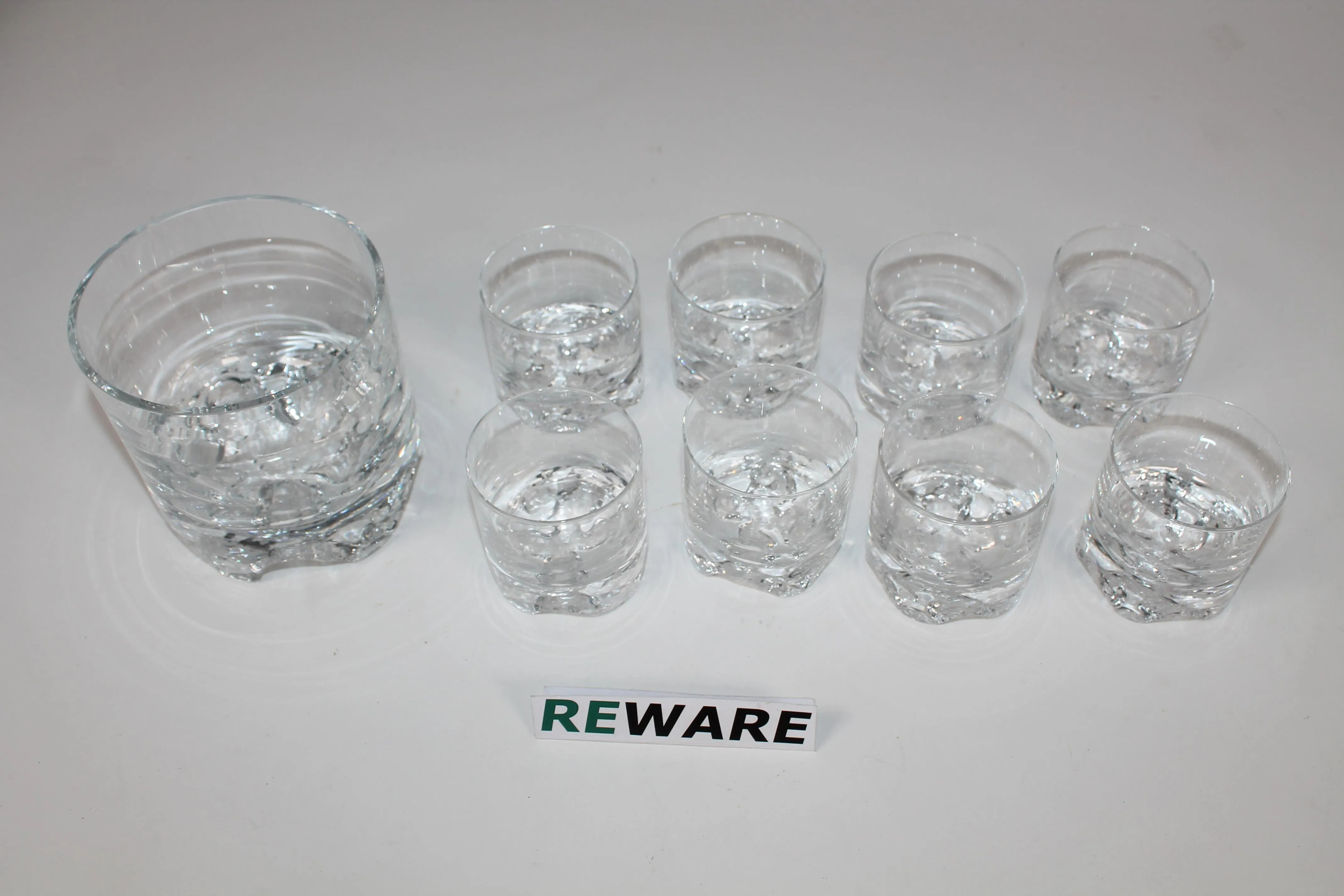 Iittala Gaissa jääpala-astia ja lasit 6 kpl. Tapio Wirkkala. Jääpala-astia korkeus 11,5 cm ja halkaisija 12 cm. Lasit korkeus 7 cm ja halkaisija 6,5 cm.