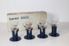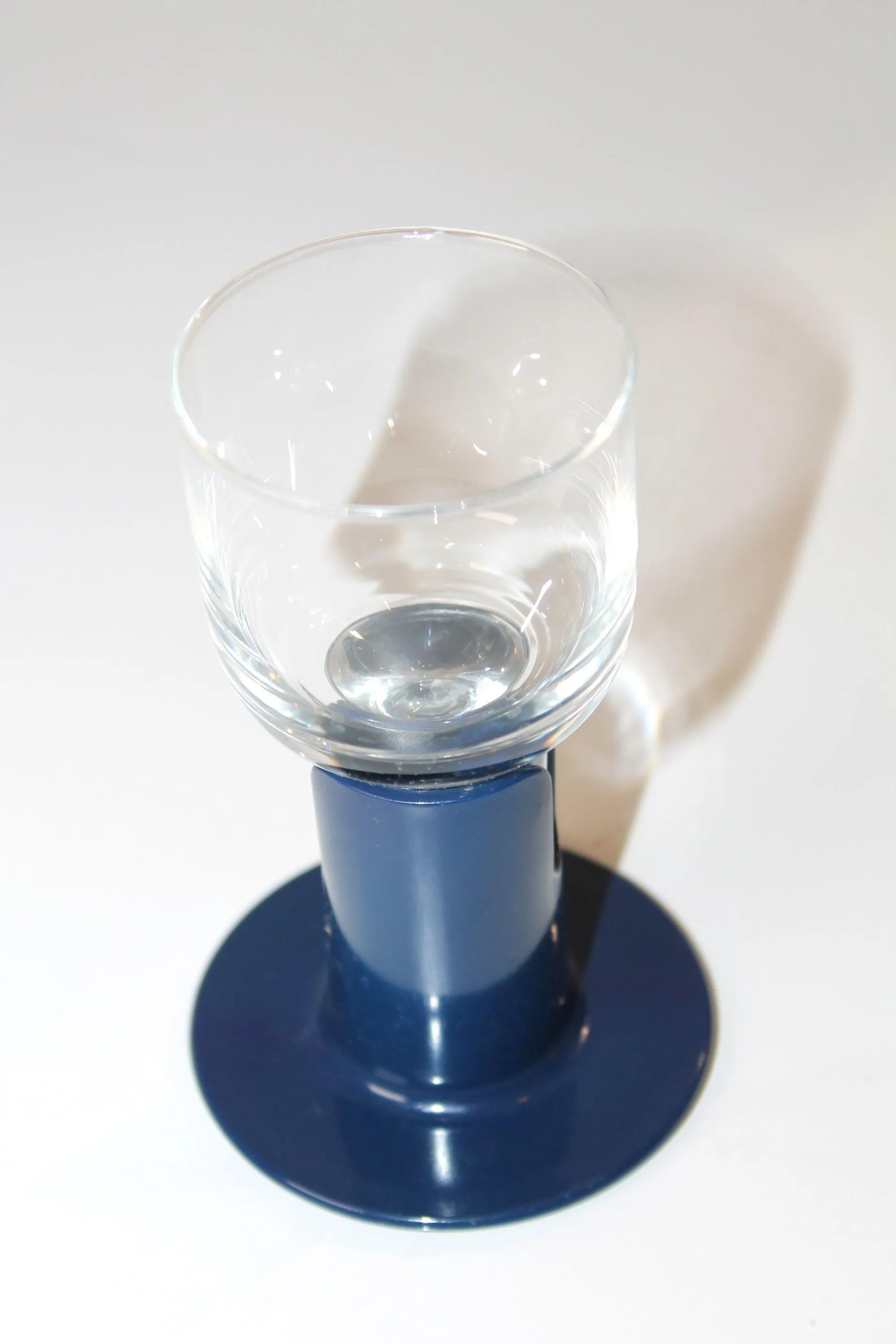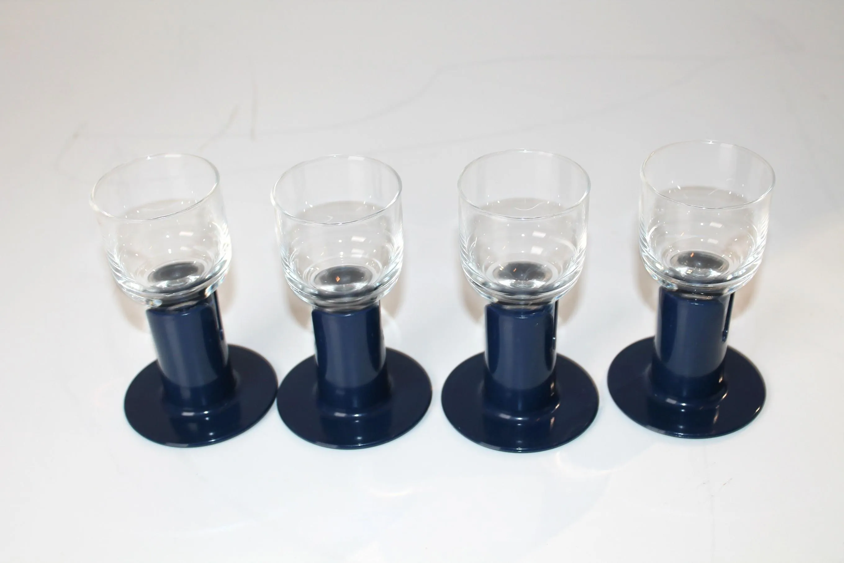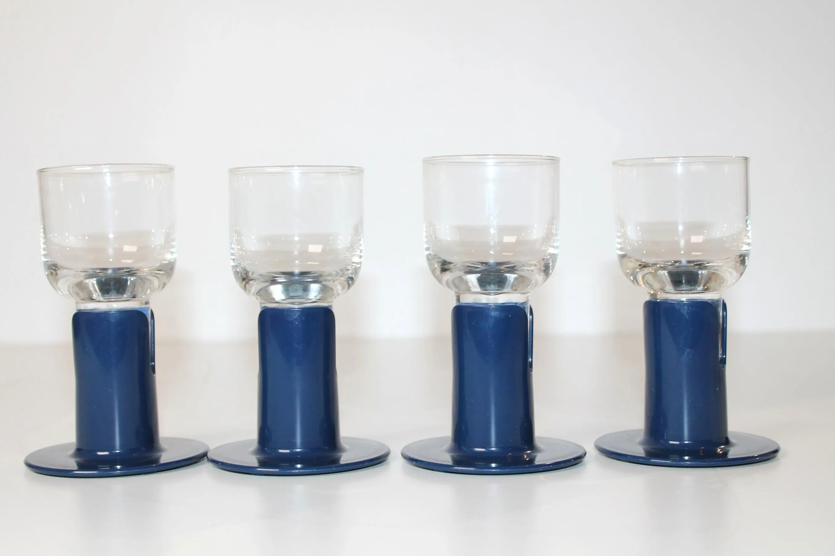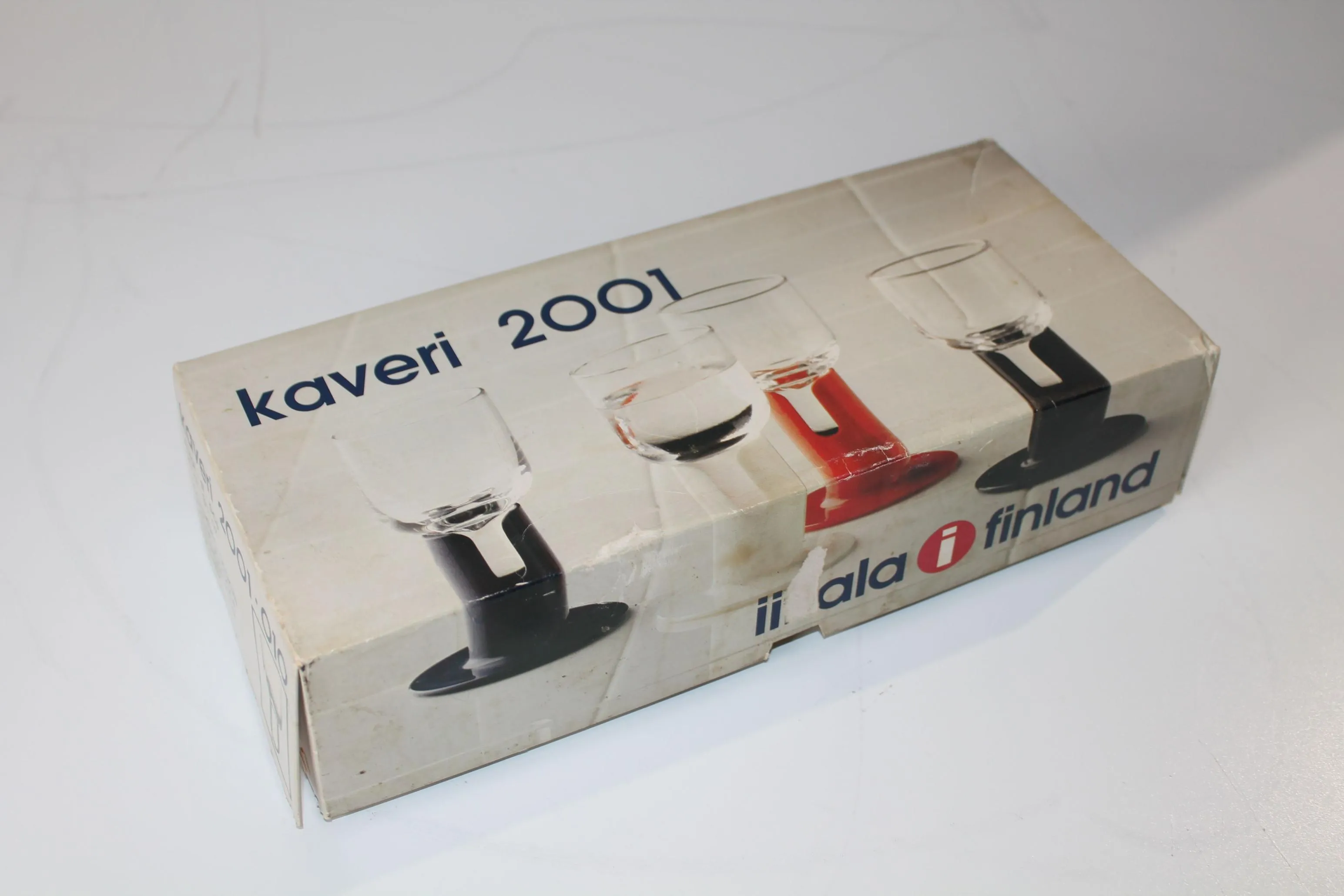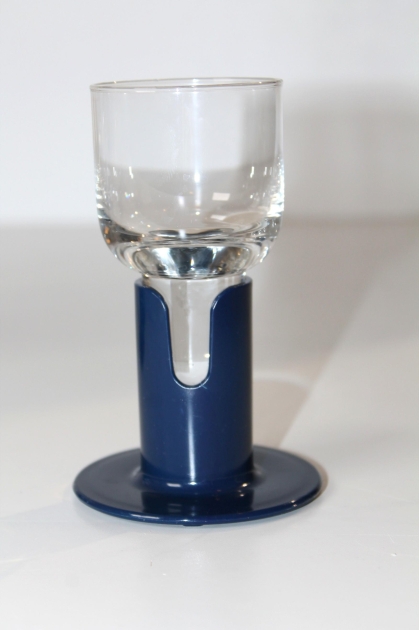 Kaveri 2001 snapsi/vodkalasit. Ahlström / Iittala Jorma Vennola. Kirkas ja sininen muovijalka. Korkeus: 11,5 cm, halkaisija 5,5 cm. Tilavuus 10 cl. Muoviosassa iittala painatus. Valmistettu: 1980-1987. Alkuperäinen pakkaus.