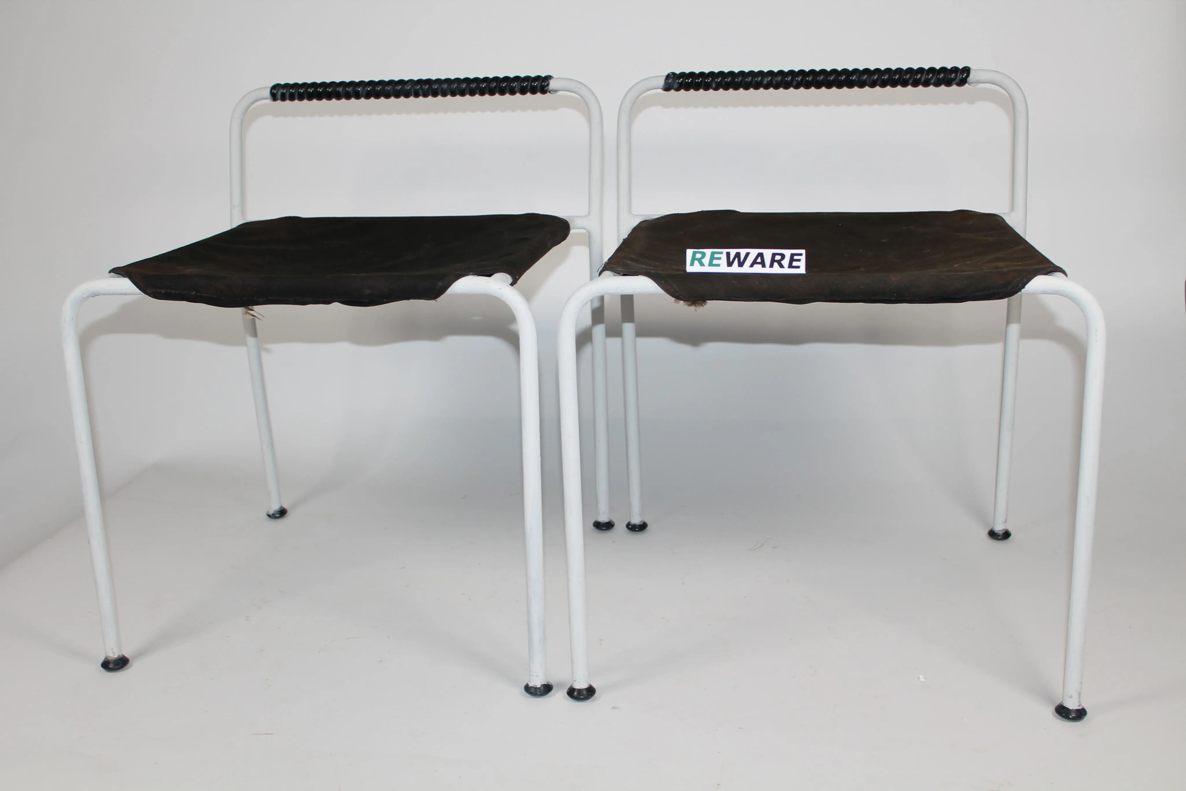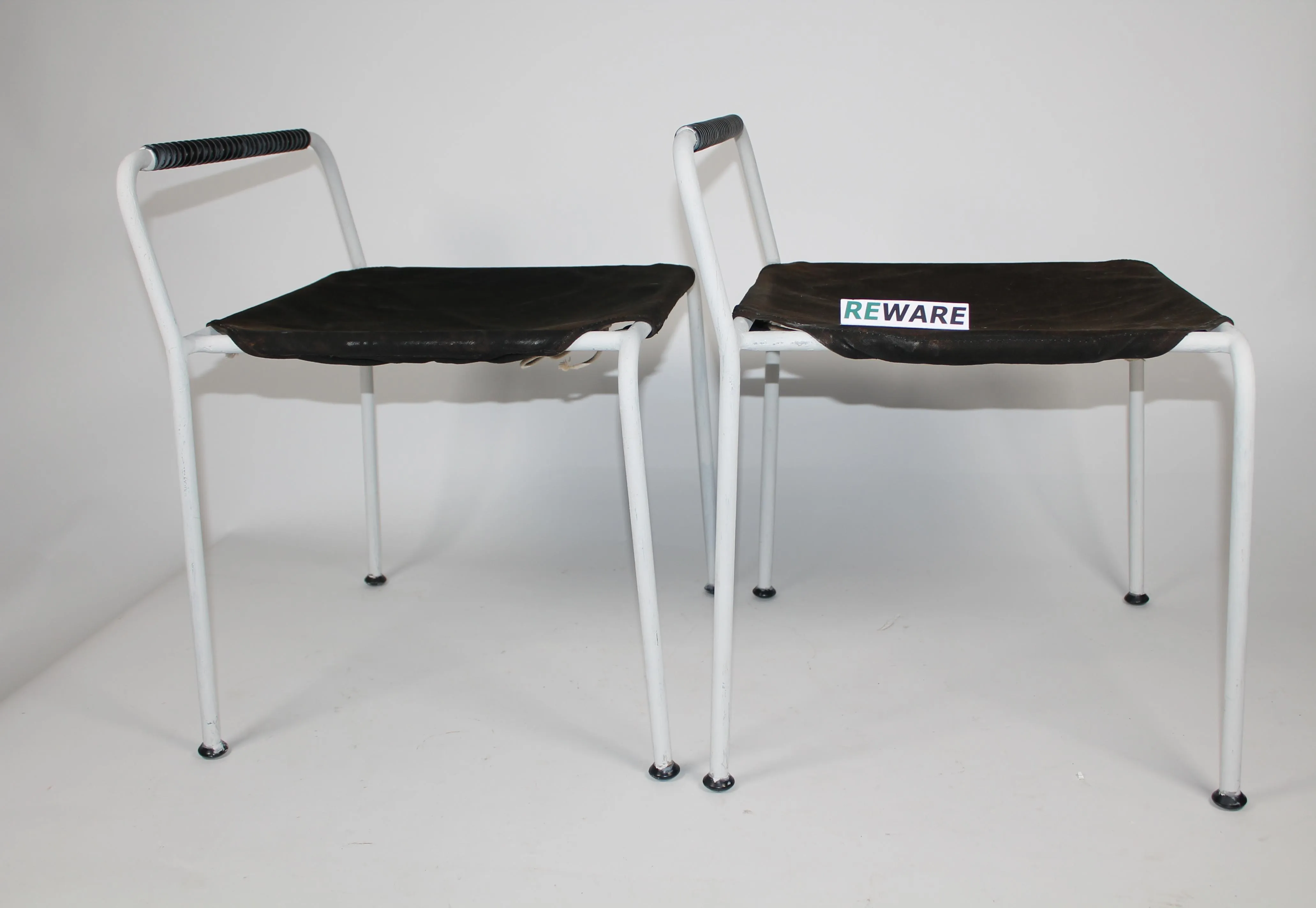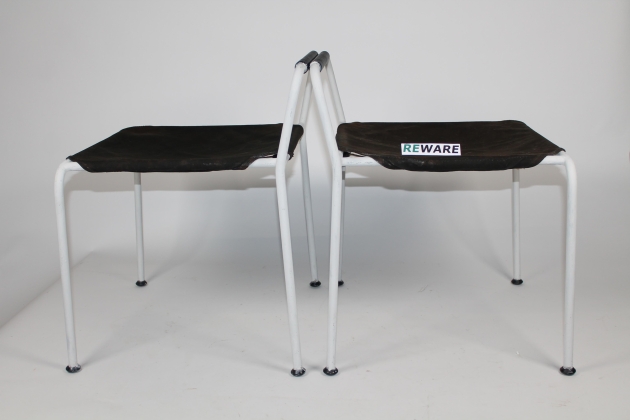 Merivaara jakkarat 2 kpl. Aarne Ervin 1970-luku. Runko metallia joka maalattu uudestaan. Alkuperäiset kankaat. Korkeus 57 cm, leveys 48,5 cm ja syvyys 45 cm.