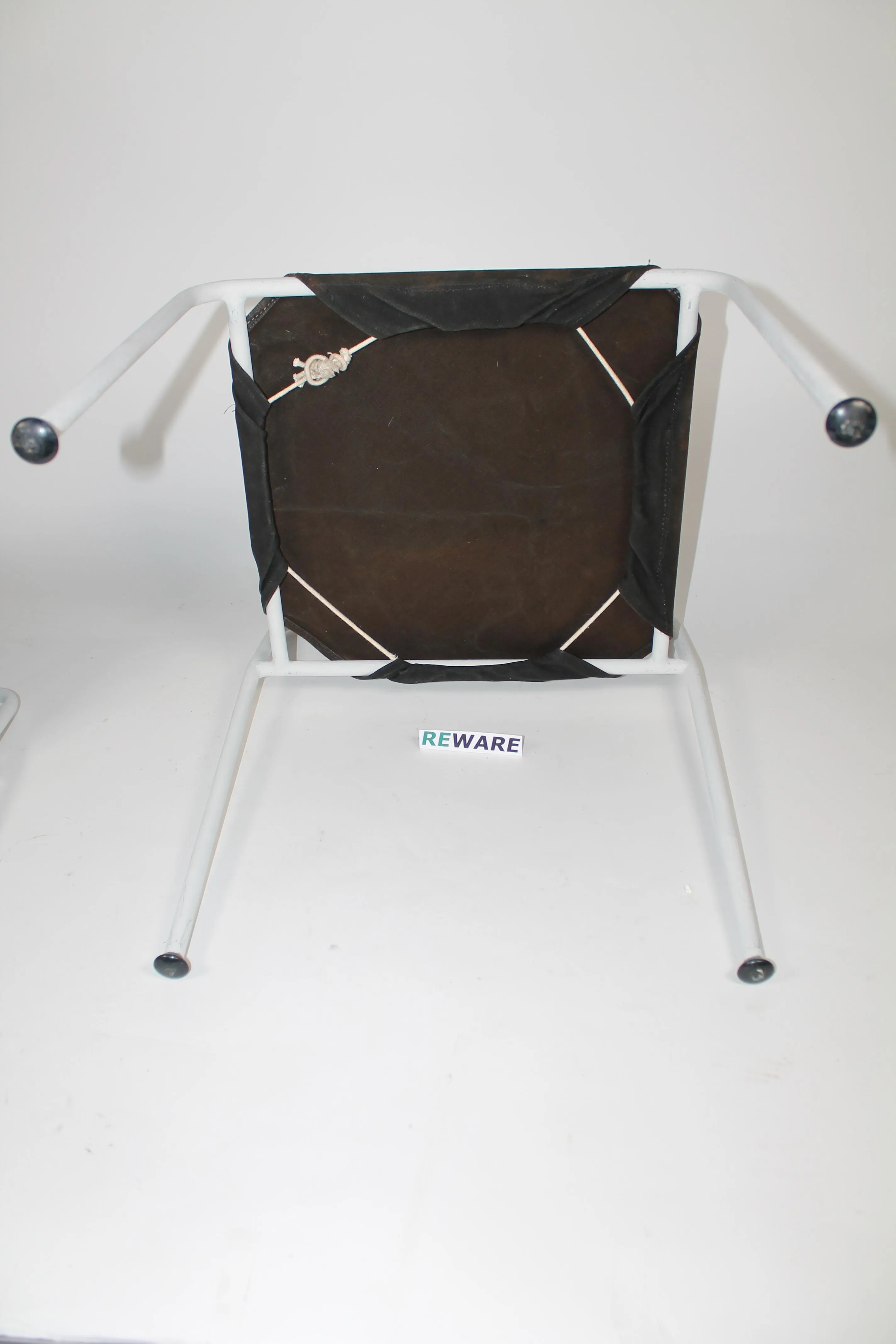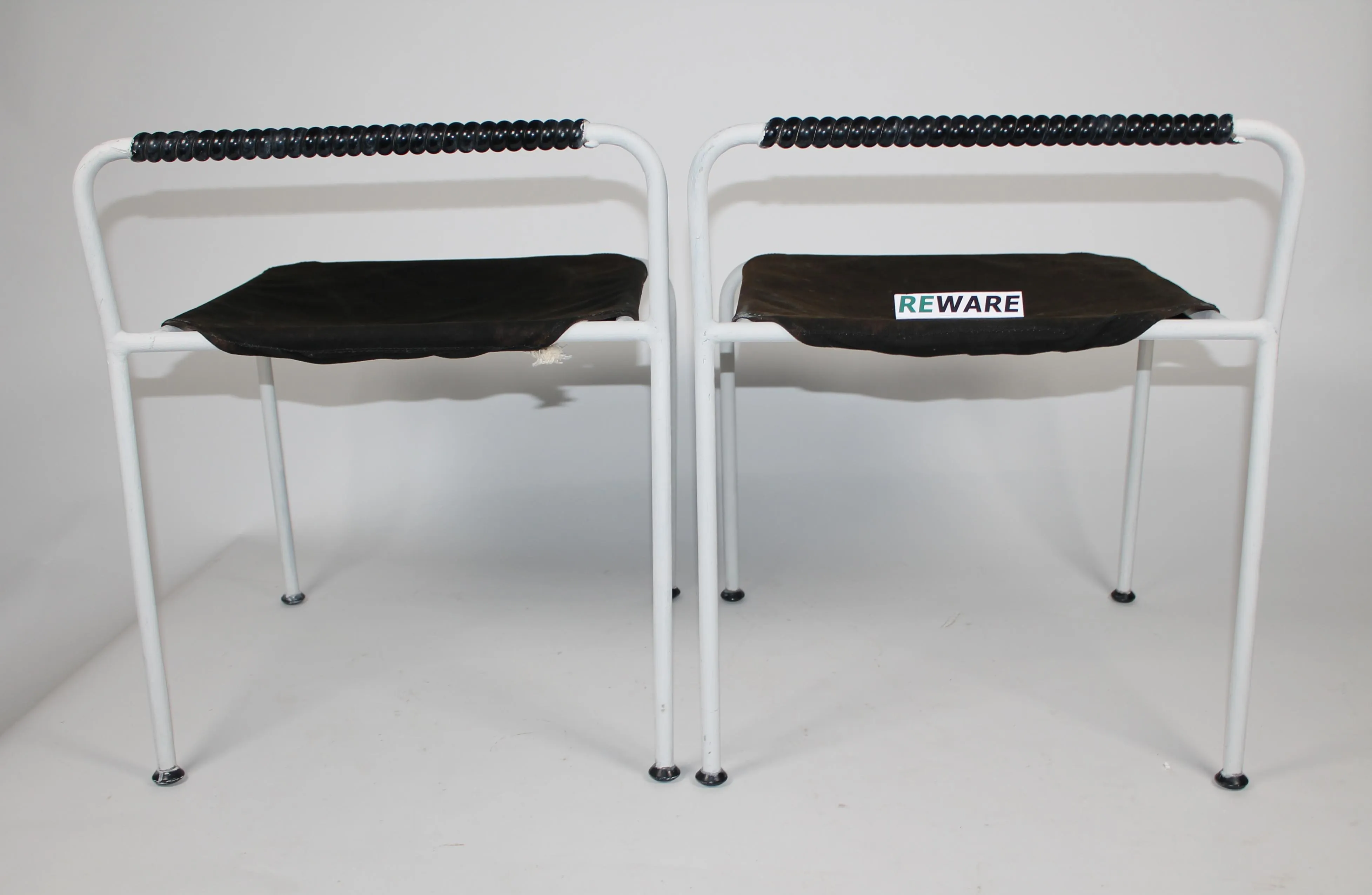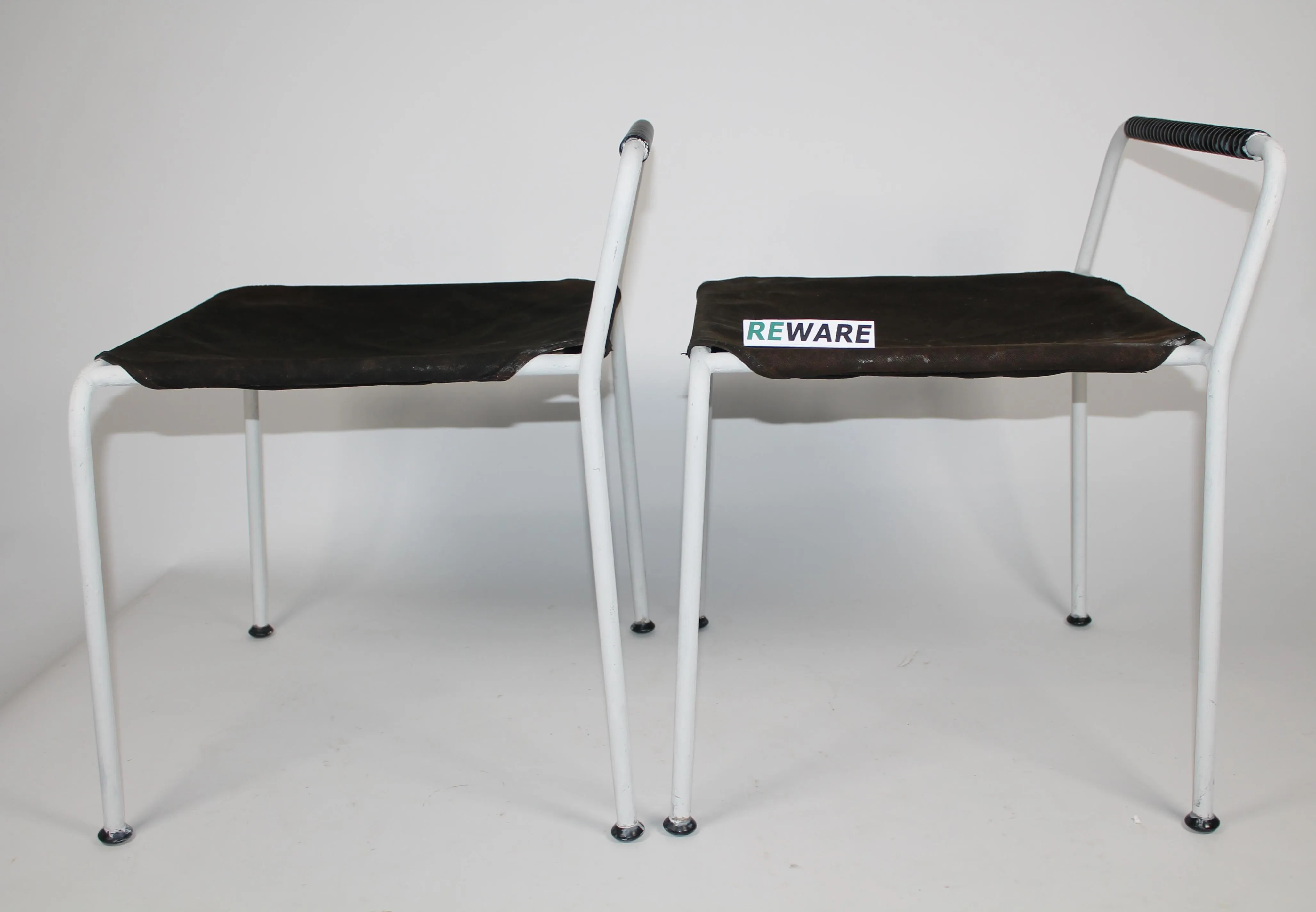 Merivaara jakkarat 2 kpl. Aarne Ervin 1970-luku. Runko metallia joka maalattu uudestaan. Alkuperäiset kankaat. Korkeus 57 cm, leveys 48,5 cm ja syvyys 45 cm.