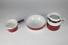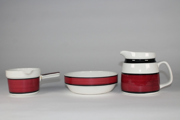 Rörstrand Carmen kannu, kastikekannu ja kulho. Kannu kork 14 cm, halk 12 cm, pientä krakelointia. Kastikekulho halk 11,5 cm kork 8,5 cm. Kahva liimattu. Kulho halk 18,5 cm kork 6 cm. Käsin maalatut 1970-luku. Carl-Harry Stålhane. Vähäistä kulumaa.