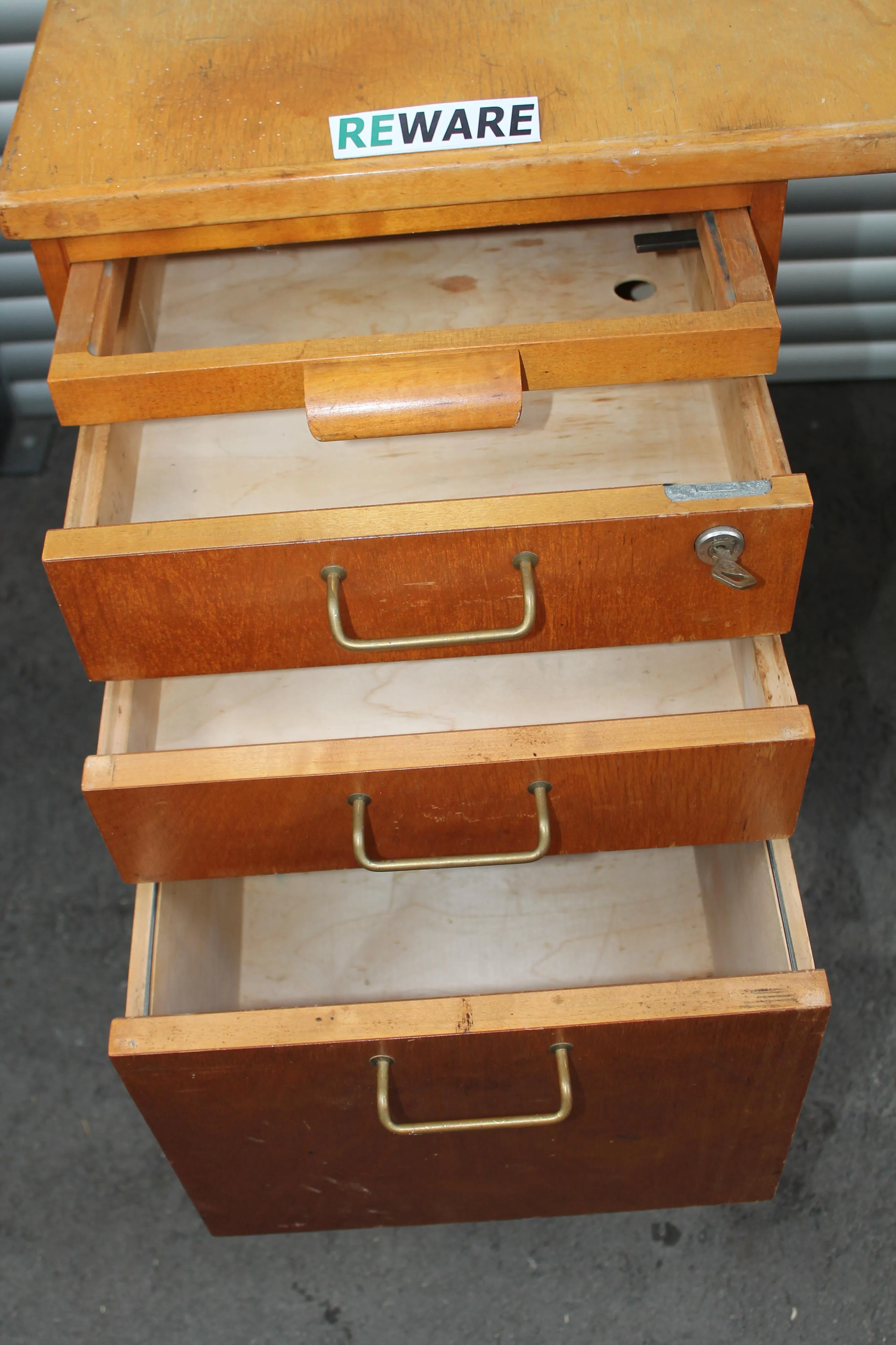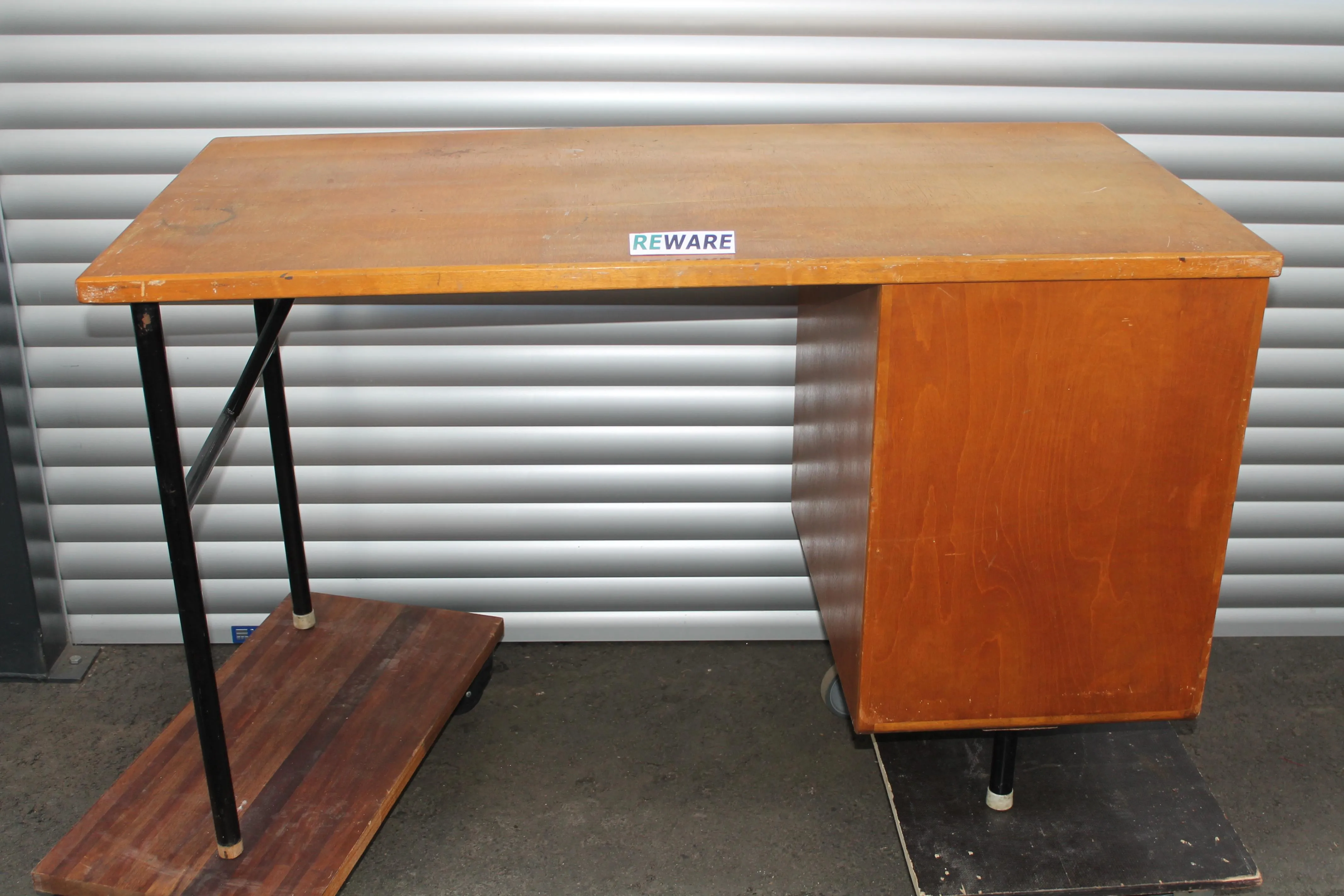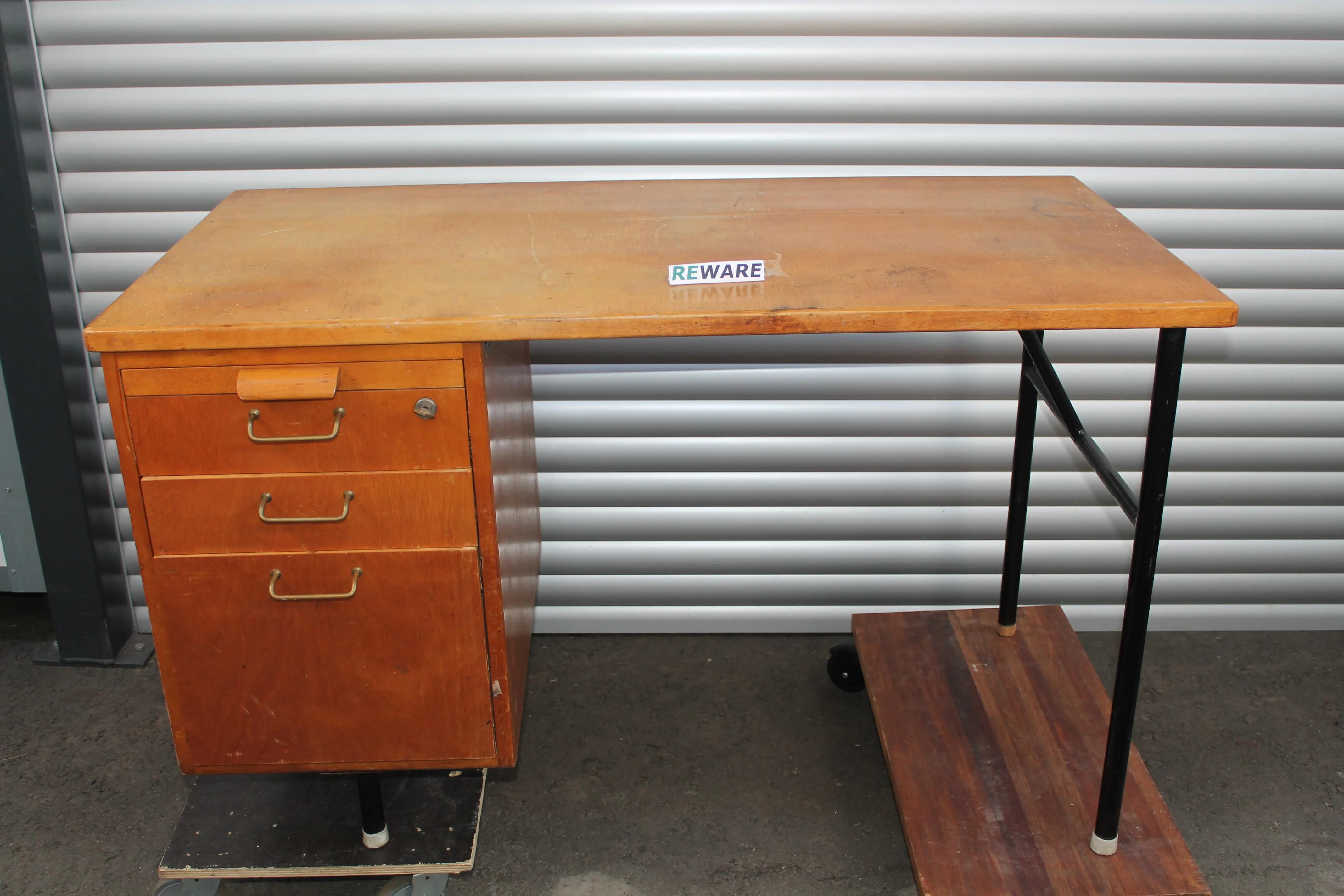 Fiskars tyyppinen TVH konttoripöytä 1950-luvulta. Pituus 120 cm, syvyys 62 cm ja korkeus 73 cm. Lukittavat laatikot.